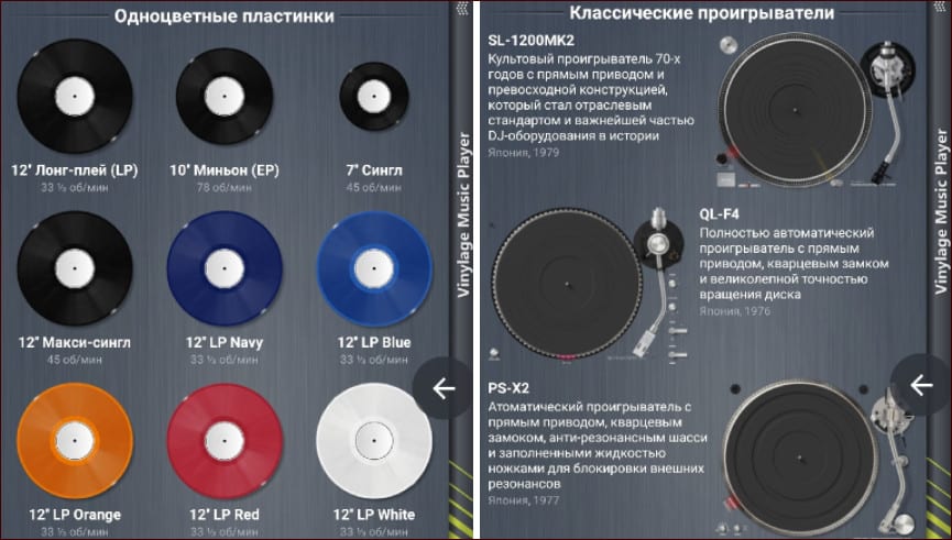 Vinylage Music Player – плеер для тех, кто ценит стиль ретро. Интерфейс имитирует внешний вид проигрывателя виниловых пластинок. В настройках вы можете выбрать классические и современные вертушки, а также изменить внешний вид разных материалов корпуса: алюминий, сосна, дуб и так далее