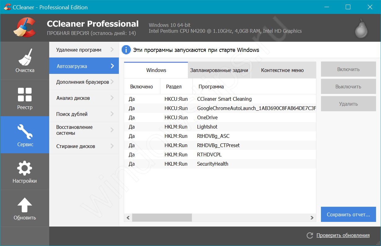 Приложение оптимизатор и «чистильщик» системы. Очень популярное и мощное решение от компании Piriform. С этой утилитой вы узнаете, как можно просто оптимизировать и очистить систему или же как быстро убрать автозапуск программ или планировщика на Windows 10, без особых усилий.