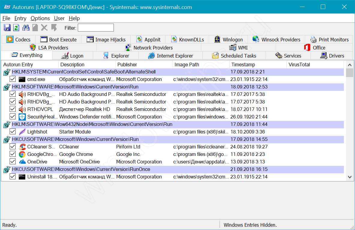 Настройки этой утилиты не столь богаты, так как вся информация уже сразу отображается при открытии, а пользователь лишь фильтрует и анализирует полученные результаты. Именно потому неподготовленному пользователю будет сложно ориентироваться в Autoruns.