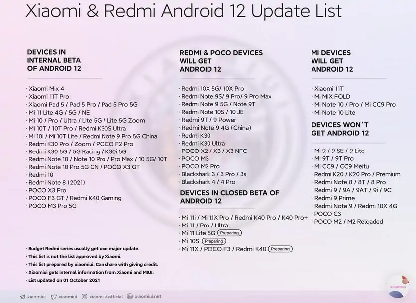 В настоящее время во внутренней программе бета-тестирования Андроид 12 находятся несколько моделей смартфонов Сяоми. Вероятность того, что они получат обновление максимальная. По состоянию на начало 2022 года список такой: