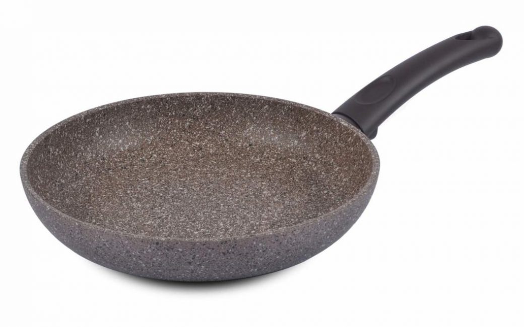 - Гранитное покрытие. Технология производства сковородок с данным напылением очень проста. На металлическую основу наносится тонкий слой гранитной крошки, который образует защитную пленку. Изделия с данным покрытием отличаются утолщенными бортиками.