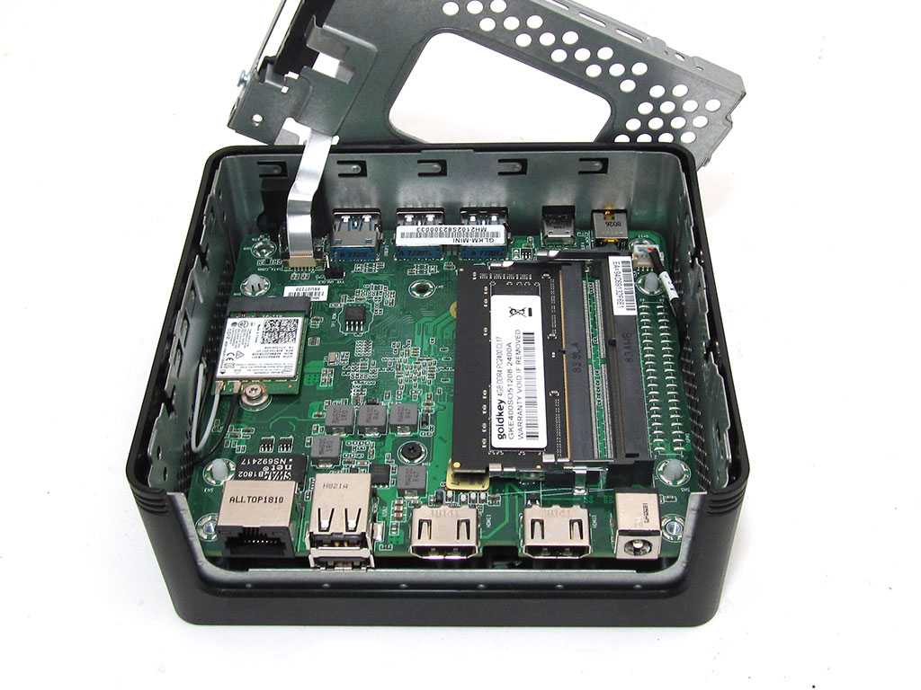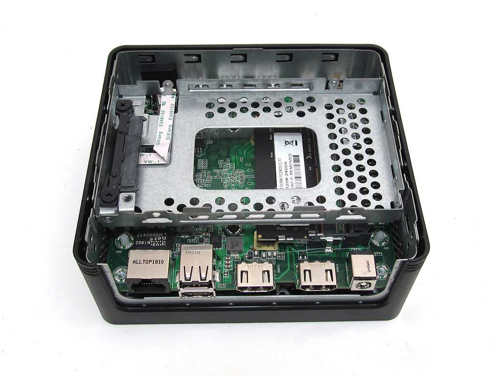 Разборка ECS LIVA Z2 очень проста, что очень хорошо. Это единица, которую любой может обслуживать или обновлять. Чтобы получить доступ к внутренним частям, просто выкрутите четыре нижних винта. После этого нижнюю пластину можно снять. На данном этапе пользователи могут установить 2,5-дюймовый жесткий диск или SSD по своему выбору. Если вы планируете обновить память, просто сдвиньте лоток жесткого диска, и он поднимется и уйдет в сторону.