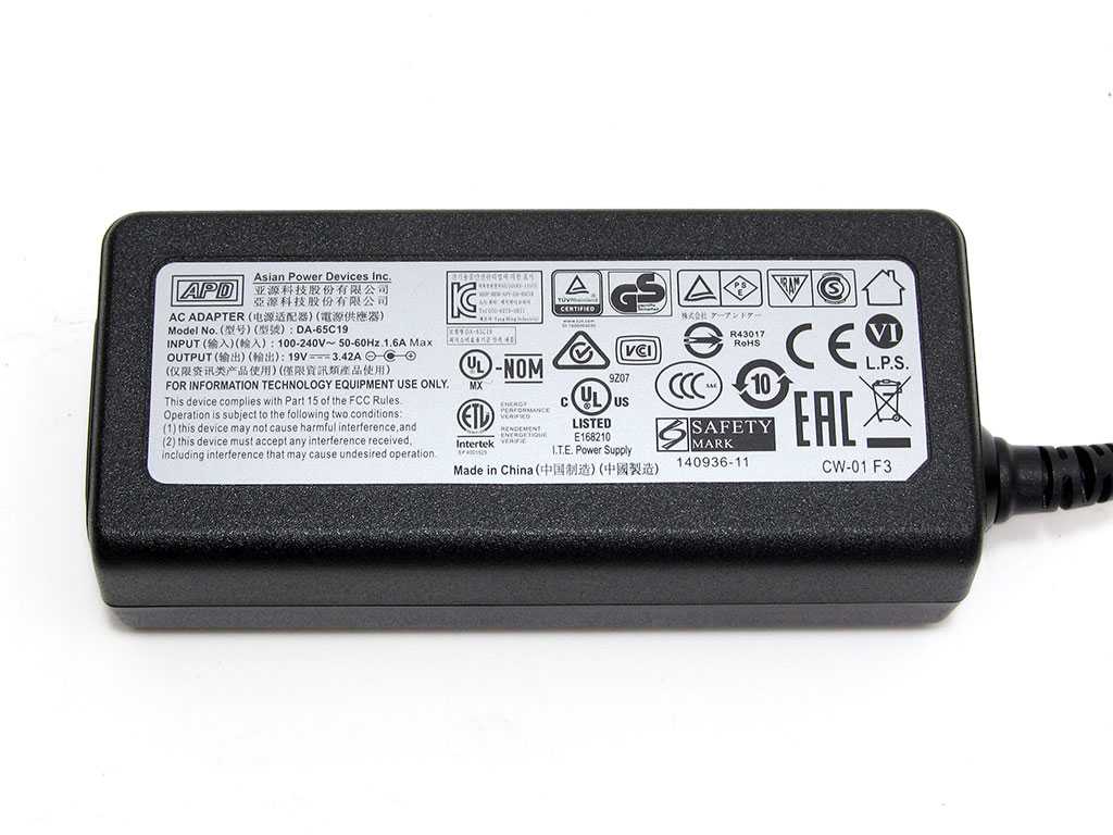 Адаптер питания от Asian Power Devices имеет мощность 65 Вт с номинальным напряжением 19 В и силой тока 3.42 А (модель #DA-65C19).