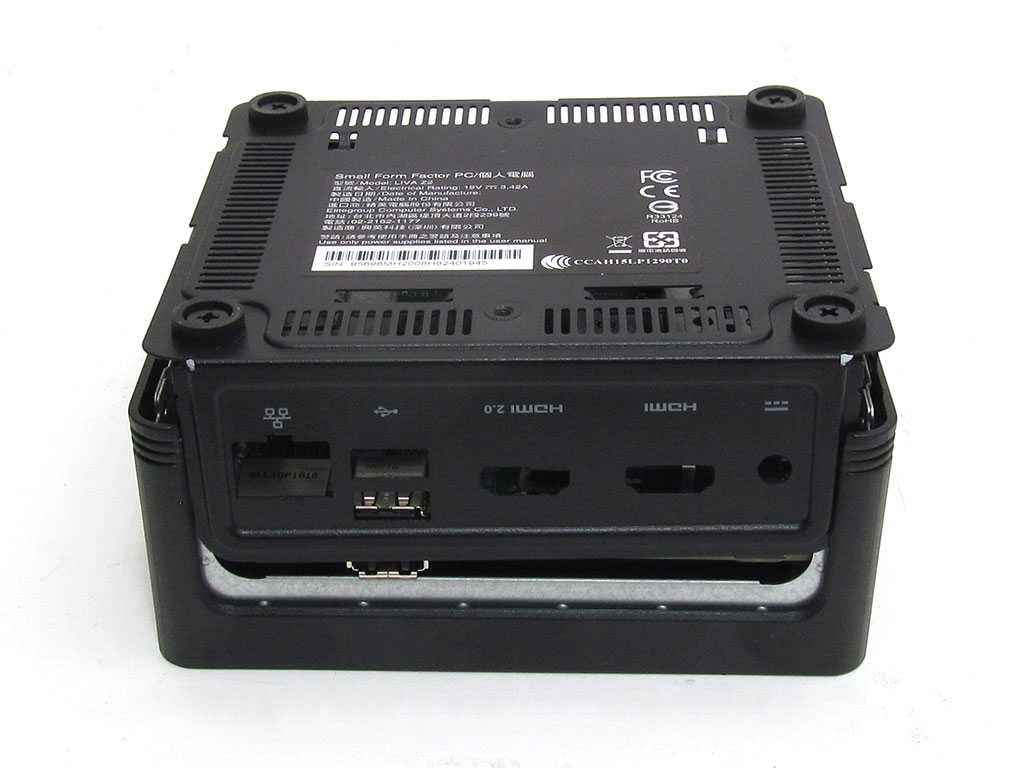 На обратной стороне пользователи найдут порт питания, два порта HDMI, два порта USB 2.0 и гигабитный порт LAN. Следует отметить, что порты HDMI имеют версии 1.4 и 2.0 соответственно, поэтому ECS LIVA Z2 может фактически выводить 4K при 60 Гц. ECS включила охранный ключ Kensington с правой стороны, рядом с еще одним вентиляционным отверстием для улучшения воздушного потока.