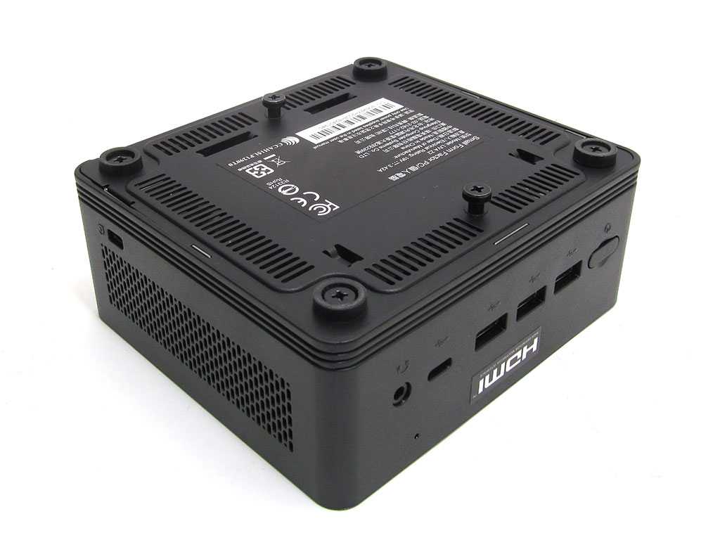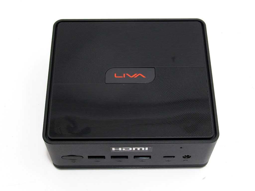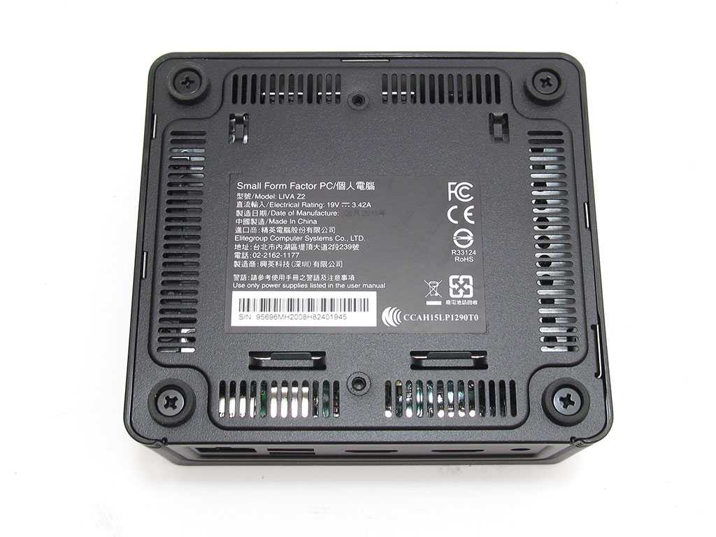 Верхняя часть LIVA Z2 имеет два рифленых сегмента с логотипом LIVA в центре. Помимо этого, верх довольно прост, без каких-либо разных функций или аспектов. Перевернув систему, вы увидите четыре винта с резиновыми втулками, которые не только удерживают корпус, но и работают как противоскользящие ножки. Эти ножки поднимают агрегат достаточно, чтобы поток воздуха попадал в вентиляционные отверстия, расположенные вокруг внешнего края нижней пластины. Некоторую информацию, такую как электричество устройства, дату изготовления и серийный номер, также можно найти на дне.