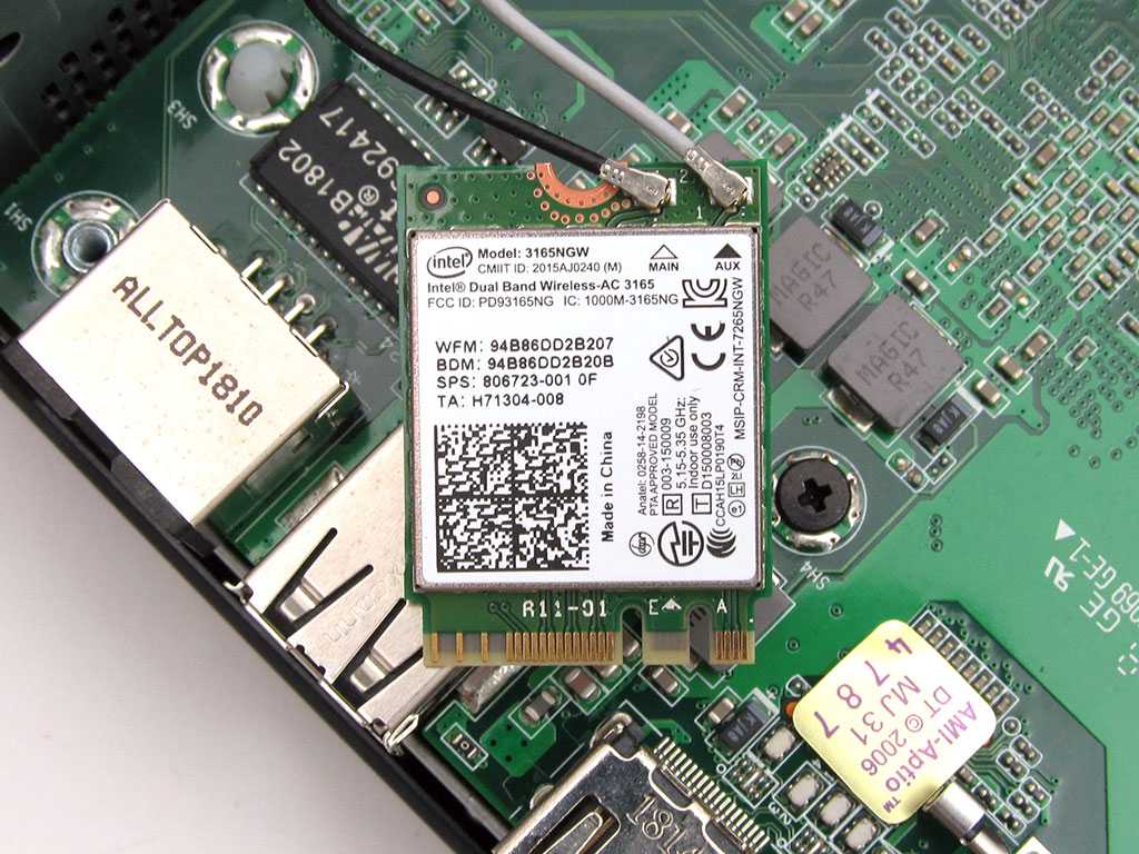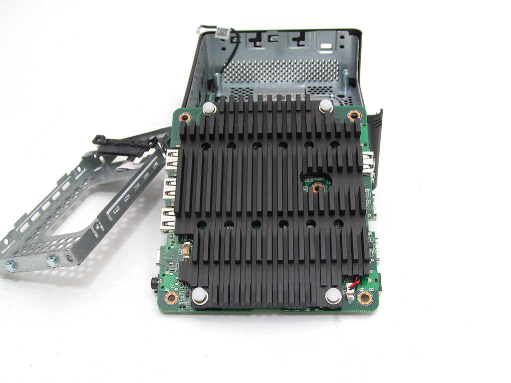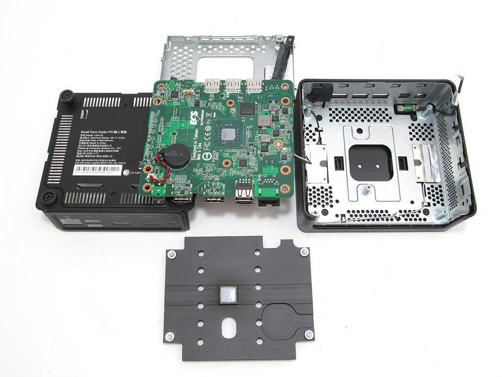 Один винт в центре удерживает материнскую плату после того, как все остальное было убрано. Снятие этого винта и отсоединение кабеля рядом с разъемами SODIMM DDR4 позволит удалить материнскую плату. Будьте осторожны в отношении антенных проводов WiFi. Когда все разобрано, и удалена материнская плата, становится ясно, что ECS установила максимально большой алюминиевый радиатор, который они могли использовать, исходя из того места, которое предусмотрено в корпусе. Снятие радиатора также простое: сожмите толкающие штифты и надавите на него, и радиатор выйдет.