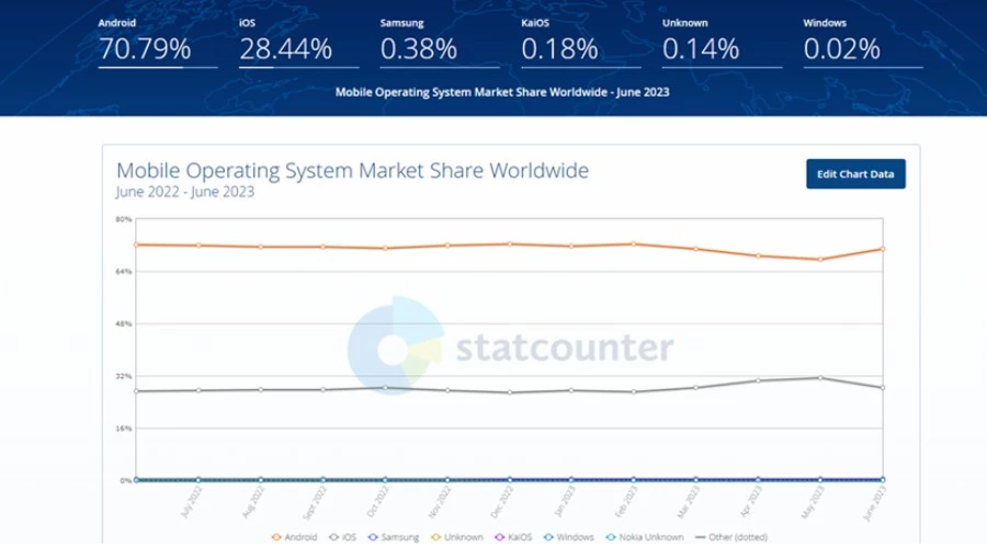 Samsung занимает третье место с 0.38%, за ним следует KaiOS (0.18%). Телефоны с Windows едва регистрируются, всего 0.02%.