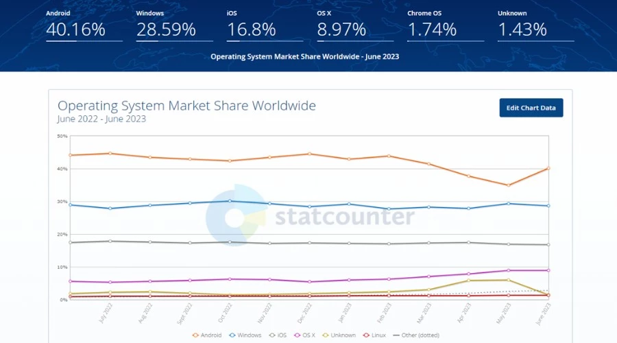 Если мы проигнорируем iPhone и подсчитаем все устройства, использующие iOS и другие мобильные операционные системы, у Android будет 40.16% пирога, а у iOS — 16.8%.