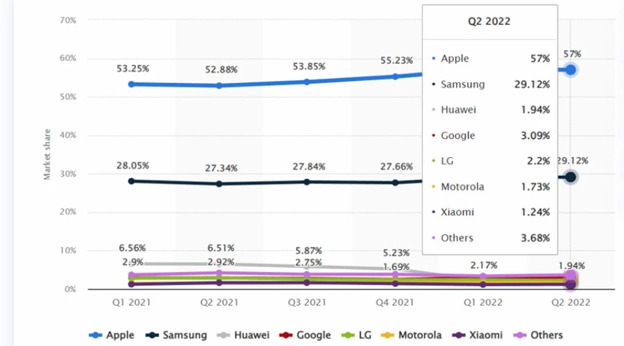 Канада — одна из немногих стран, где iPhone доминирует над Samsung и всеми остальными Android-смартфонами вместе взятыми. Он удерживал эту позицию в течение всего 2021 года и до первого квартала 2022 года, когда ему принадлежало 57% рынка смартфонов.