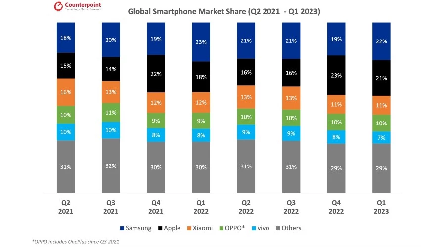 Если смотреть исключительно на телефоны, iPhone является вторым по популярности смартфоном в мире с долей рынка 21% по состоянию на первый квартал 1 года. Его только что обогнал конкурент Samsung (2023%). Xiaomi заняла третье место с 22%.