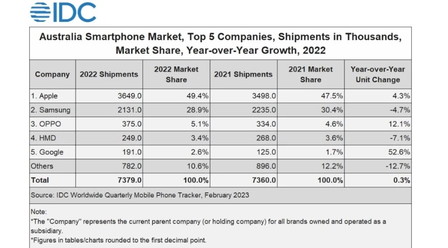 В 2022 году на долю iPhone приходилось 49.4% рынка смартфонов в Австралии, а Samsung отставала с долей 28.9%. Это на 1.9% больше для iPhone по сравнению с предыдущим годом и составило 3.649 млн проданных единиц.