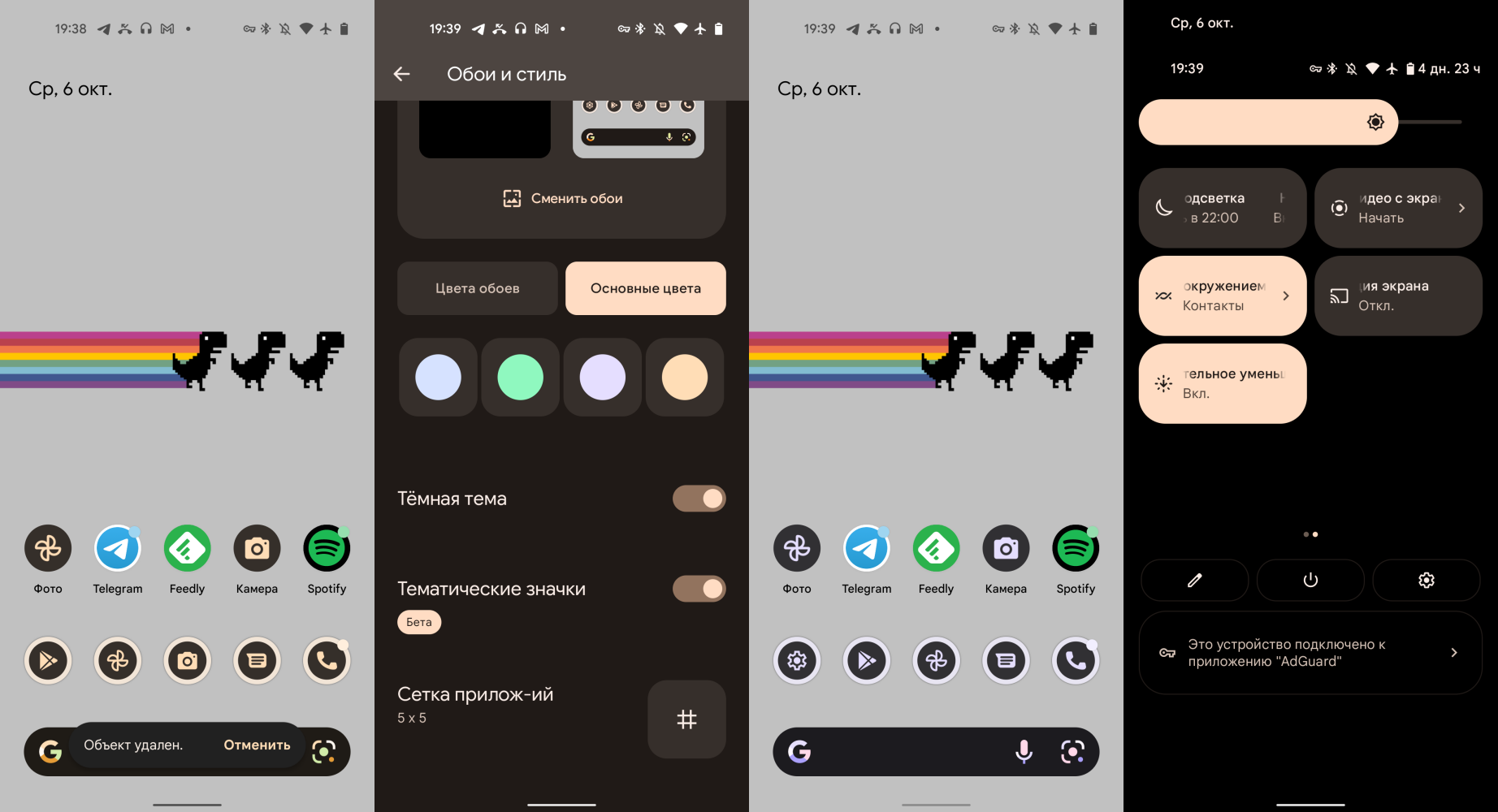На этом возможности кастомизации не закончились: есть темы оформления, настраиваемые иконки приложений, а оттенки в меню адаптируются под цветовую схему интерфейса. Правда, лучше использовать стандартные значки — если активировать иконки из темы, то смотрится такой интерфейс не очень гармонично, ведь сторонние приложения не адаптируются под этот стиль, сохраняя прежний вид. Плюс можно настроить сетку со значками приложений под настроение.