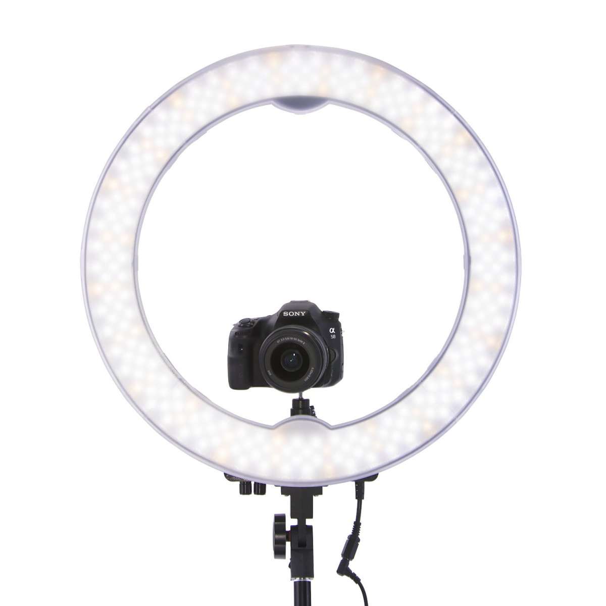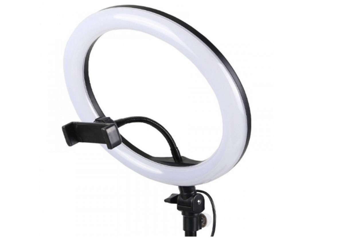 Светодиодная лампа для освещения площадок во время съёмки фото или видео. Обеспечивает высококачественное дополнительное освещение, которое подойдёт не только людям, работающим с камерами, но и визажистам, стилистам и т.д. Оптимальна для осуществления портретной/предметной фотосъёмки. Модель имеет кольцевую форму, оснащена 128 светодиодными лампами. Диапазон цветовых температур – 5600-3200 К. Общая мощность составляет 10 Вт. Оборудована выдвижным регулируемым штативом, обеспечивающим подъём от 65 до 210 см. Комплект поставки включает непосредственно лампу, штатив, держатель для смартфона, пульт управления яркостью.