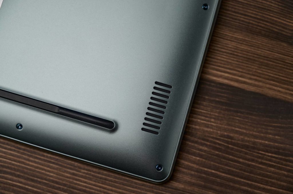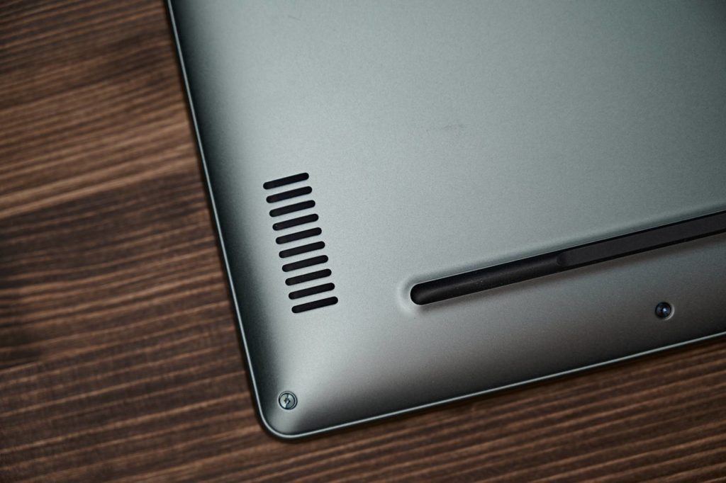 Под экраном, с тыльной стороны нижней панели есть два выреза для охлаждения. Если устройство стоит на столе, это не мешает. А вот использовать ноутбук лежа или сидя неудобно: тело чувствует тепло.