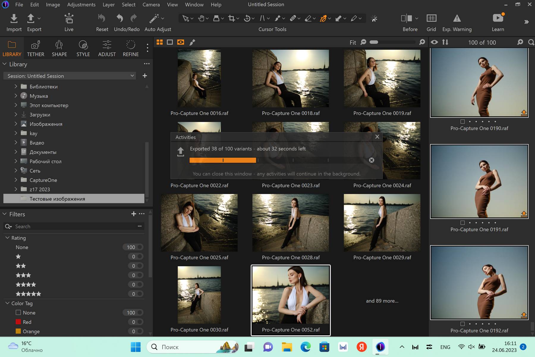 При работе с тяжёлыми RAW файлами в Capture One ноутбук даже не начинает нагреваться. Импорт нашего тестового набора из 100 файлов с разрешим 100Мп (210Мб каждый) занял всего 87 секунд. Для экспорта этих же файлов в Capture One в самом высоком разрешении в форме JPEG потребовалось 7 минут 45 секунд.