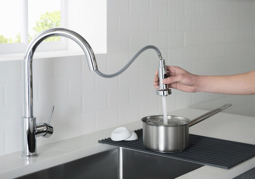 Смеситель с выдвижной лейкой представляет собой прибор, в который встроен подвижный шланг, увеличивающий длину излива. По внешнему виду такой смеситель ничем не отличается от стандартной модели, но при этом расширяет рабочее пространство на кухне.