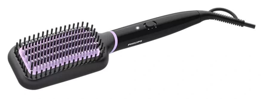 У Philips Style care essential всего 2 температурных режима – 170 и 200 °C. Переключаются кнопкой на ручке. Световой индикатор сообщает о готовности к работе. Нагревается примерно за 50 сек. Длинный шнур 1,8 м на шарнире для удобства пользования. Девушки пишут, что времени на укладку уходит очень мало – от 3 до 5 минут. Достаточно несколько раз провести щеткой по прядям с двух сторон. Объем не теряется, имеется здоровый блеск. Для тех, у кого длинные волосы, отличная альтернатива стандартным утюжкам.