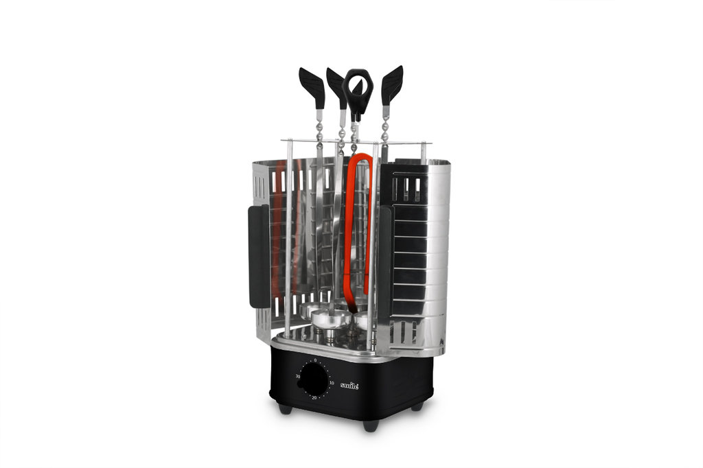 Это устройство довольно схоже с грилем, но оно способно выполнять как его функции, так и работать в качестве электрошашлычницы. Нагревательный элемент тут располагается сбоку, что обеспечивает равномерную прожарку мяса. Кроме того, в этом агрегате предусмотрена неплохая емкость для жира. Единственным недостатком модели является круглая форма шампуров. Из-за нее продукт часто сползает вниз, где ему не хватает достаточной температуры для приготовления.
