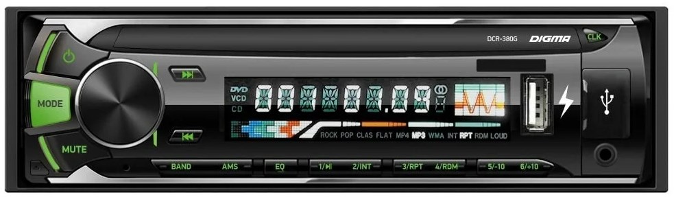 Плюсы и минусы: компактный корпус, простота установки; кнопки с зеленой подсветкой; привлекательный дизайн; поддержка USB-памяти и карт SD и MMC. Bluetooth отсутствует.