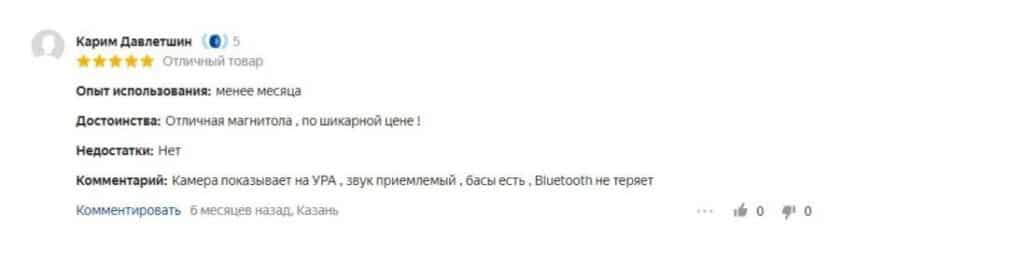 неплохой звук;наличие четырех выходов для усилителя;интегрированный микрофон, благодаря которому становится возможным голосовое управление;ДУ пульт с ИК-портом;русифицированная инструкция.возможны проблемы со смартфонной синхронизацией, решить которые получается только посредством сброса настроек до заводских;хороший звук только со штатными динамиками;некоторые покупатели посчитали цену магнитолы завышенной.Мне нравится1Не нравится1