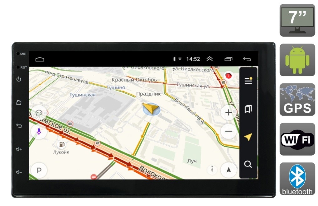 - дополнительные функции – радио с автопоиском и памятью станций, композитный видеовход (камера заднего вида включается автоматически при включении задней передачи), RCA (для подключения внешних дисплеев), внешняя антенна для GPS и радио (совместная), поддержка A2DP (для подключения стереогарнитуры).