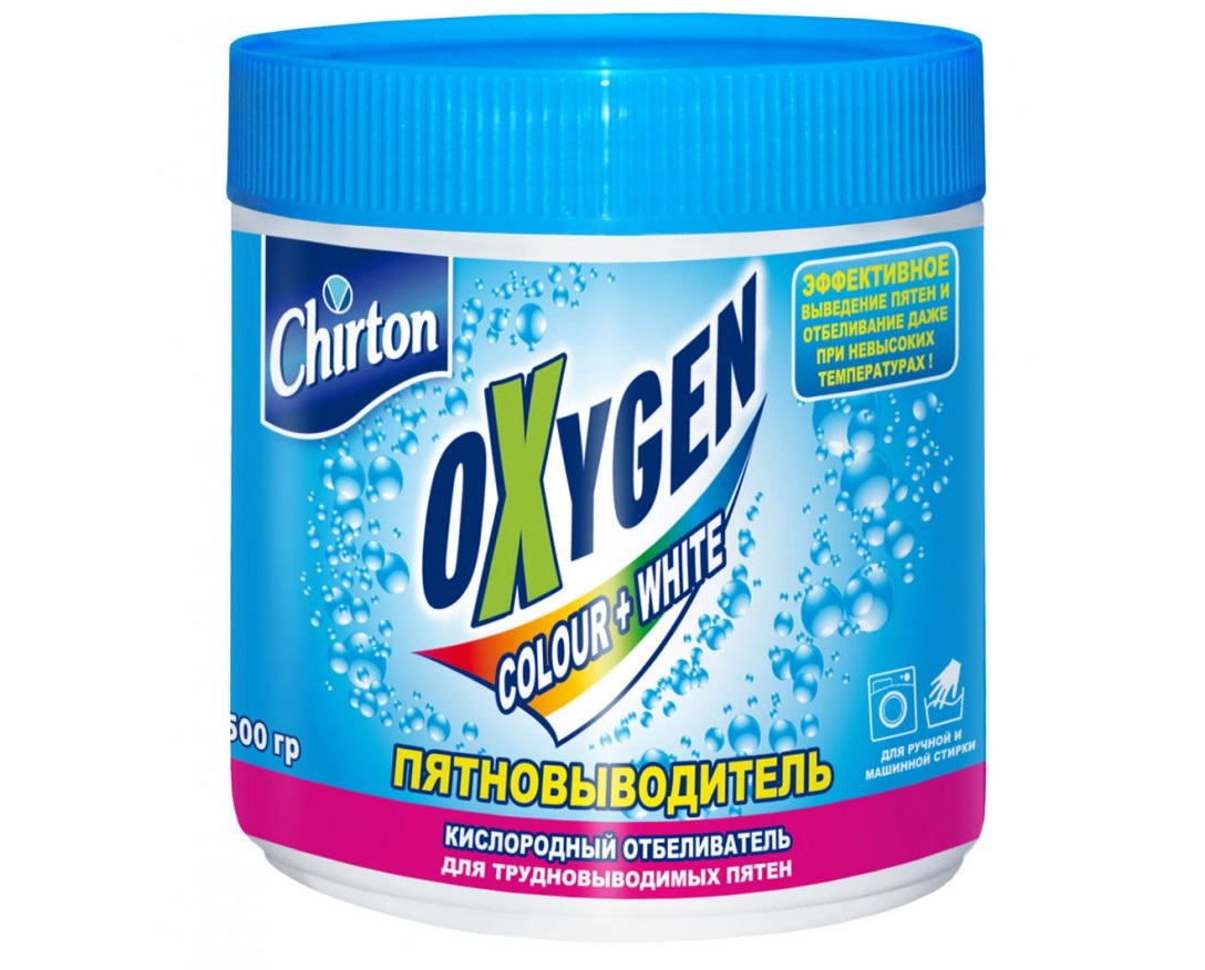 - Chirton Oxygen. Кислородный отбеливатель от ООО Амс Медиа. Выпускается в форме порошка без отдушек. Действует при любой температуре воды. Справляется с трудновыводимыми пятнами. Не рекомендуется использовать для изделий из шерсти, шелка, кожи.