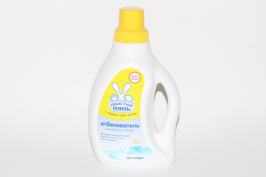 - Ушастый нянь. Производитель – ОАО Невская Косметика, выпускается в жидком виде и порошке. Не содержит хлора, действует в воде любой температуры. Используется для отбеливания детского белья из любых тканей. Не справляется с обильными загрязнениями.