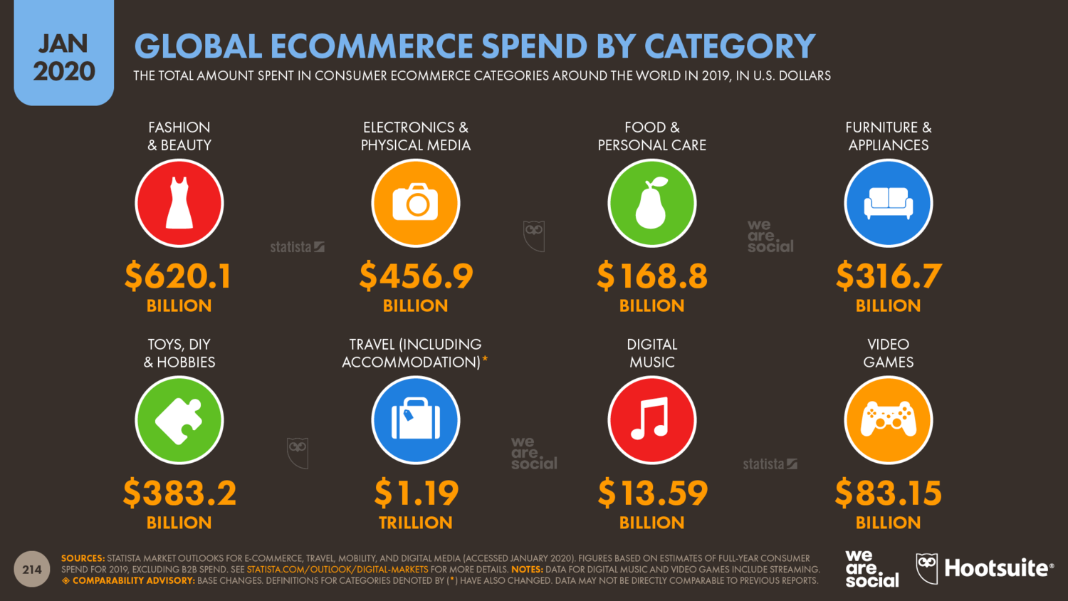 По данным Statista, мировые расходы на электронную коммерцию значительно выросли в 2019 году, хотя темпы роста сильно варьируются в зависимости от категории.