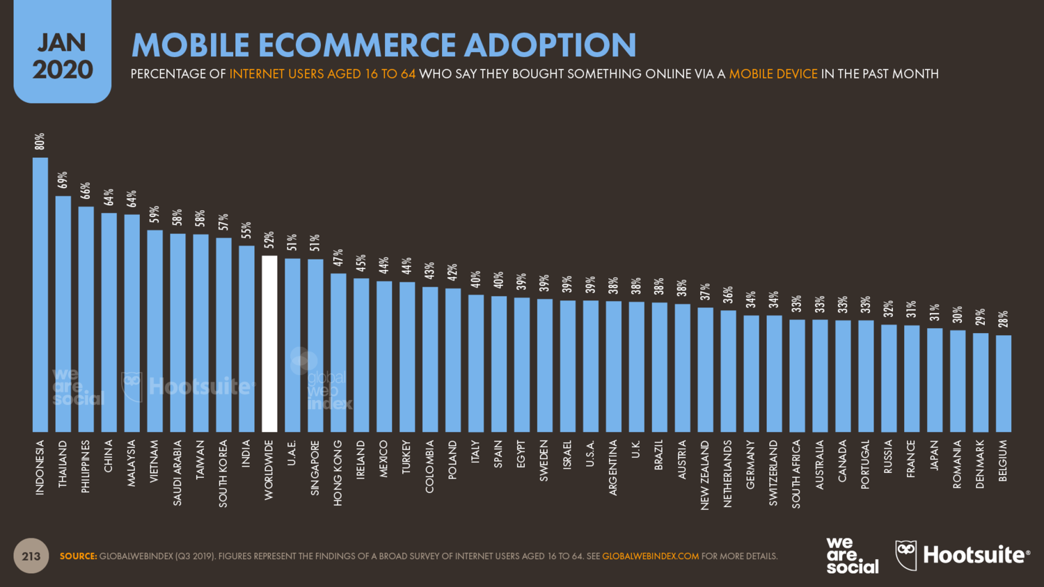 Примерно три четверти интернет-пользователей в мире в возрасте от 16 до 64 лет ежемесячно покупают что-то в онлайне. По данным GlobalWebIndex, уровень проникновения ecommerce самый высокий в Индонезии, Таиланде и Польше. Это говорит о том, что экономическое развитие не является основным фактором, определяющим популярность электронной торговли. Другие факторы не менее важны — например сайты, которые обслуживают языковые потребности и культурные предпочтения местных покупателей.