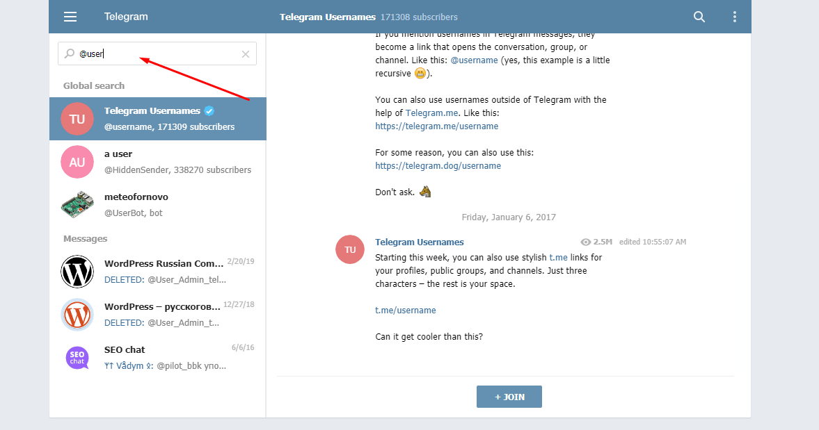 Нужно написать никнейм искомого человека латиницей через символ «@» и найти его среди результатов глобального поиска – других пользователей с похожими никами. Интересно, что так можно найти не только человека, но и, например, канал или чат-бота. У них тоже есть свои никнеймы, которые указываются при создании и используются для идентификации.