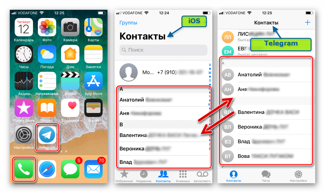 Телефонная книга iOS и перечень контактов Telegram для данной ОС являются, по сути, одним и тем же модулем. Если данные людей из списка, сформированного ранее и сохраненного в iPhone, не отображаются в мессенджере, следует предпринять следующее.