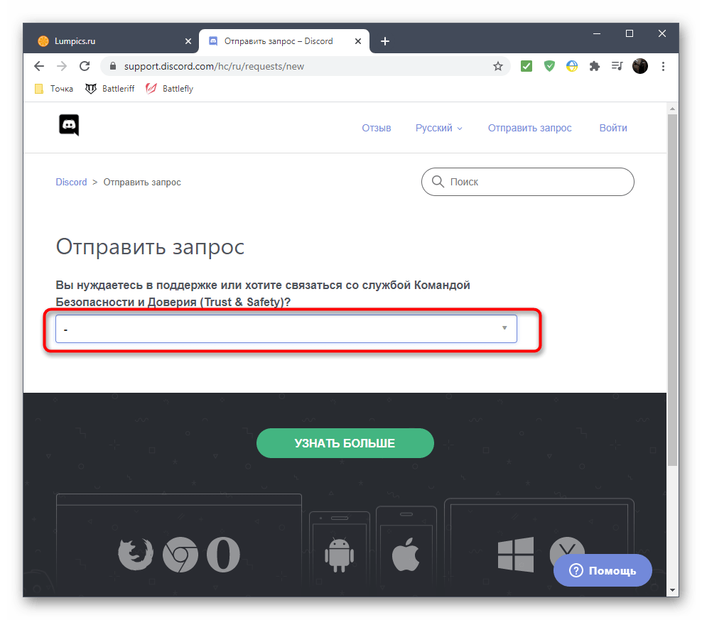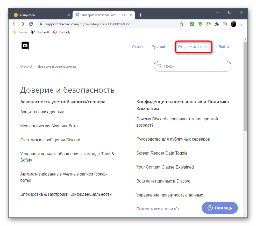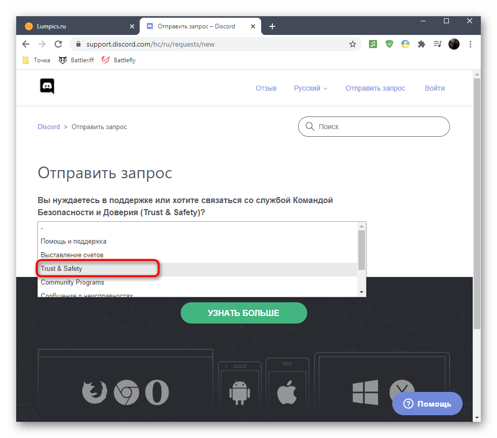 в разделе «Отправить запрос» выбрать строку «Trust and Safety»;