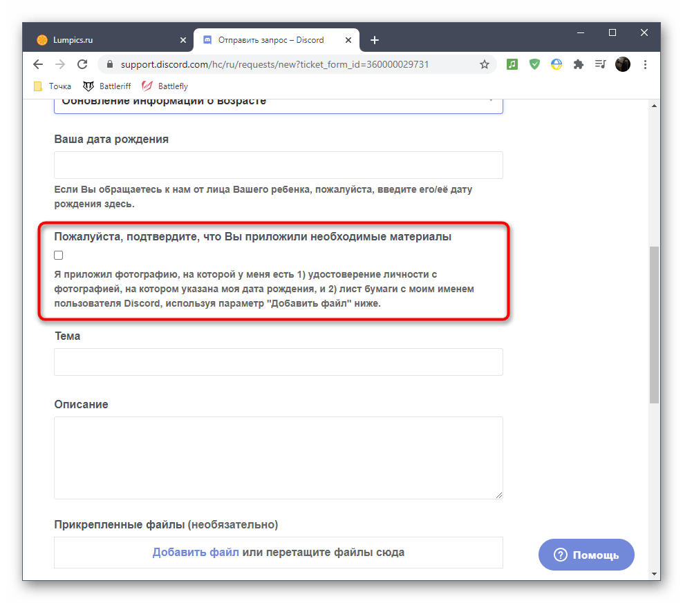 В форме вам необходимо указать дату своего рождения и, если возможно, прикрепить фотографию, на которой вы держите свое удостоверение личности.