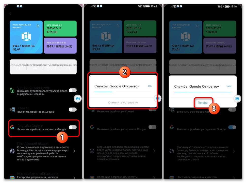 В списке на открывшемся экране найдите опцию «Включить фреймворк сервисов Google», коснитесь расположенного справа от неё переключателя. Подождите, пока VMOS скачает необходимые для функционирования служб Гугл файлы, нажмите «Готово» по завершении этого процесса.