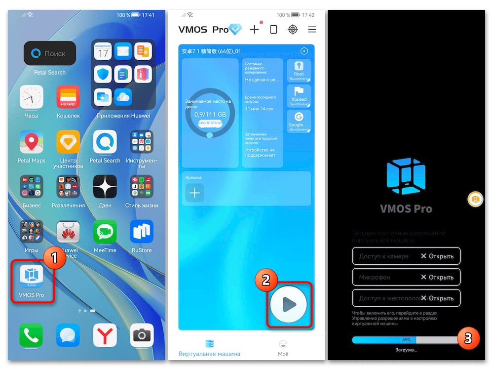 VMOS — виртуальная машина (ВМ) для Android-устройств, кроме прочего, ставшая первым инструментом такого рода, поддерживающим полноценное функционирование сервисов Google в гостевой операционной системе. Принцип получения Google Play на девайсах Huawei через VMOS заключается в установке средствами приложения независимой от EMIU отдельной ОС и запуск Магазина в её среде. Далее продемонстрирован наиболее простой сценарий реализации указанного, что выполняется в два этапа.