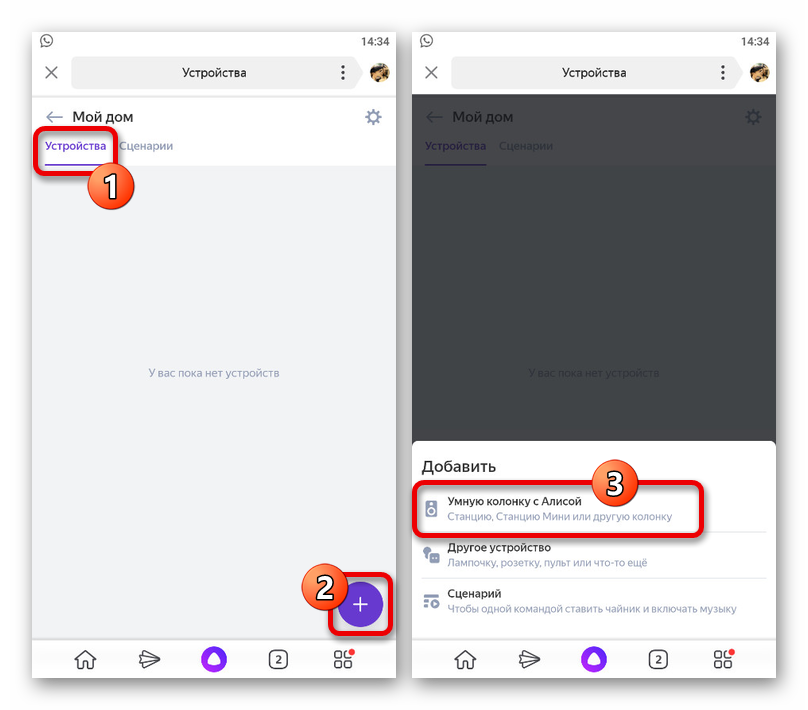 - В перечень устройств добавить новое — нажать на «+», выбрать пункт с умной колонкой.