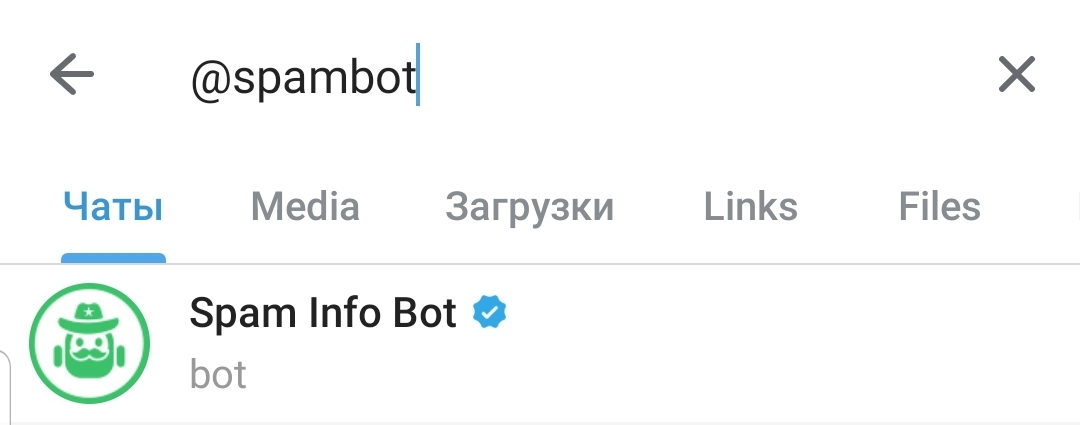- Откройте Telegram и напишите в поиске «@spambot», чтобы проверить блокировку.