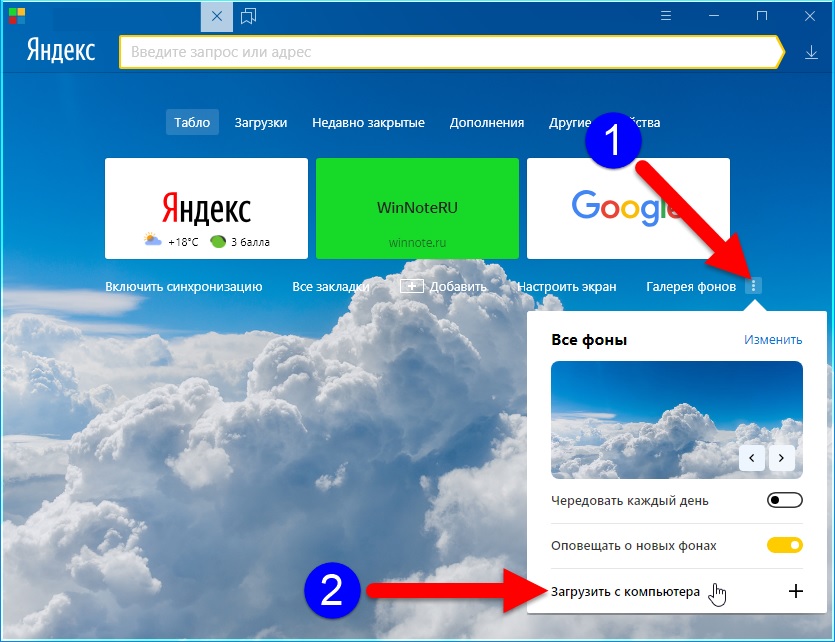 Добавление собственного фона – ещё одна важная возможность Яндекс браузера. Она позволяет установить абсолютно уникальное изображение на стартовую страницу, будь то собственная фотография или заранее скачанная из интернета. Сделать это достаточно просто: на главной странице нужно нажать кнопку с тремя вертикальными точками, рядом с кнопкой «Галерея фонов» и выбрать пункт «Загрузить с компьютера» в появившемся меню.