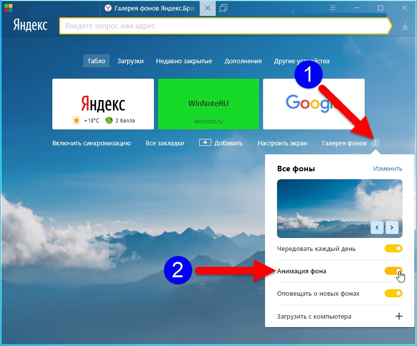 Запуск или выключение анимации фона в Яндекс.Браузере