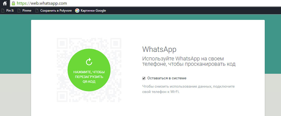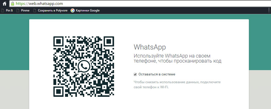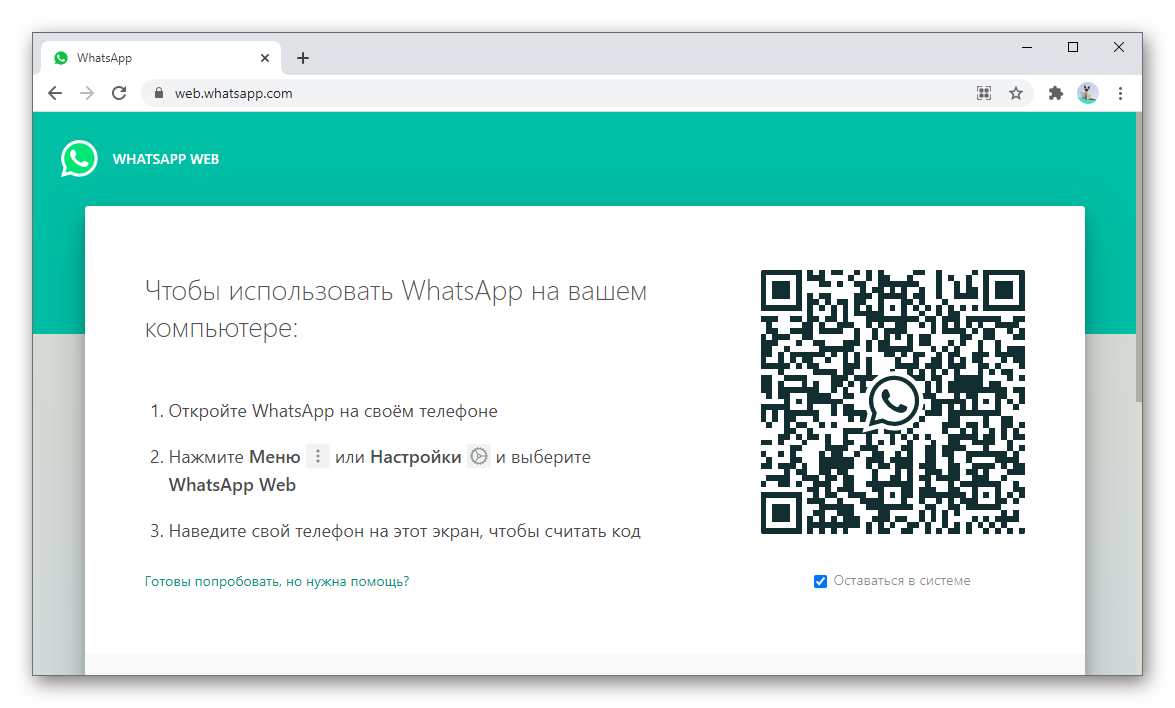 1. Первое что нам нужно — открываем свой личный ПК и заходим на страницу https://web.whatsapp.com/ Обязательно должна стоять птичка «оставаться в системе».