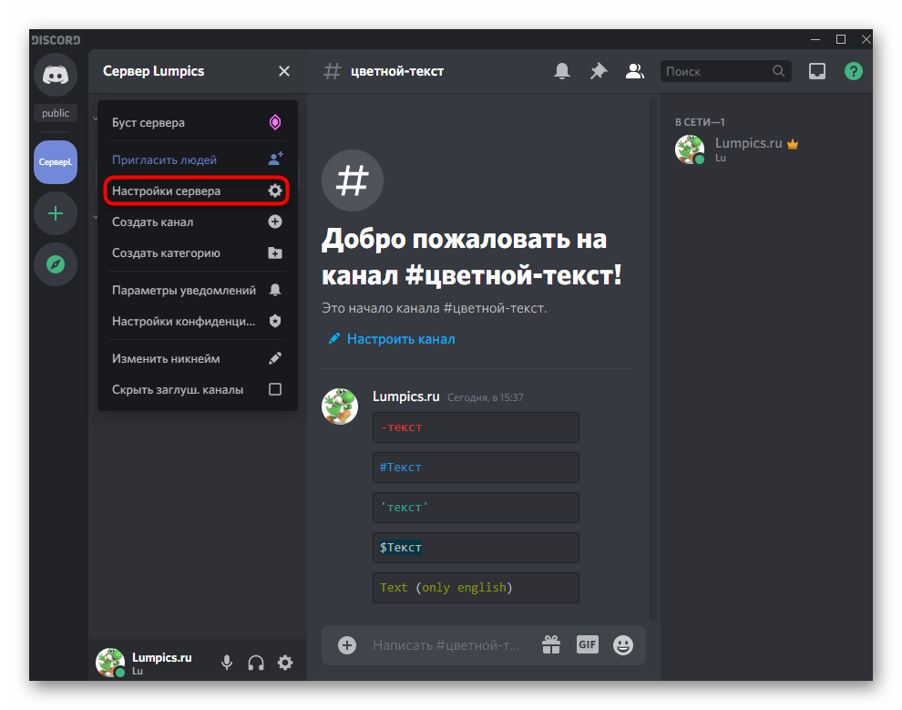 - Откройте свой сервер и нажмите по его названию для вызова меню.