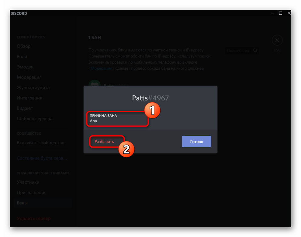 Снятие бана с участника на сервере в Discord