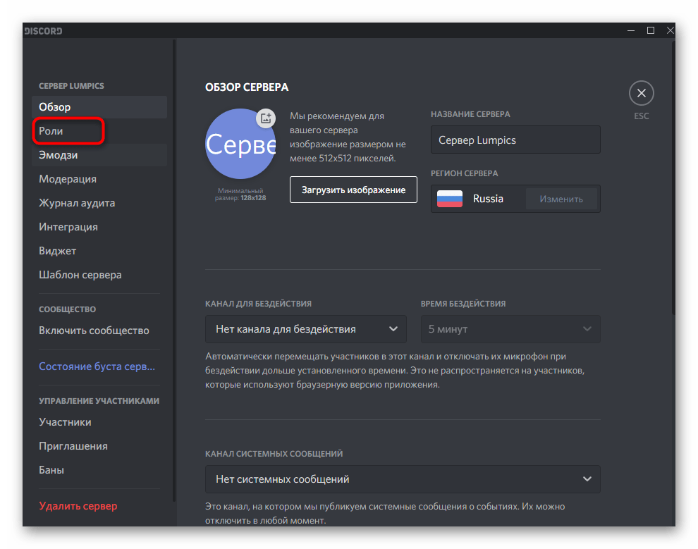 - Опуститесь к блоку «Управление участниками» и перейдите в «Роли».