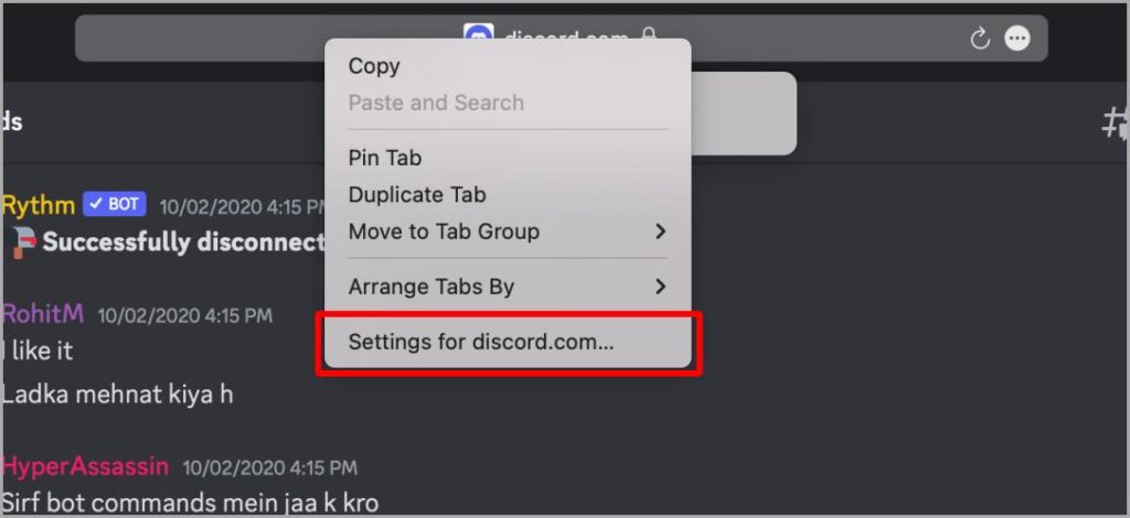 2. Щелкните правой кнопкой мыши URL-адрес И нажмите Настройки для discord.com .