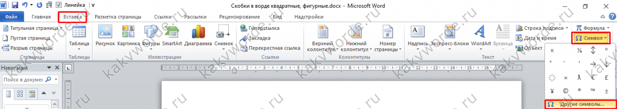 С помощью известной функции «Символы» можно вставить квадратные скобки. Вот что нужно для этого: